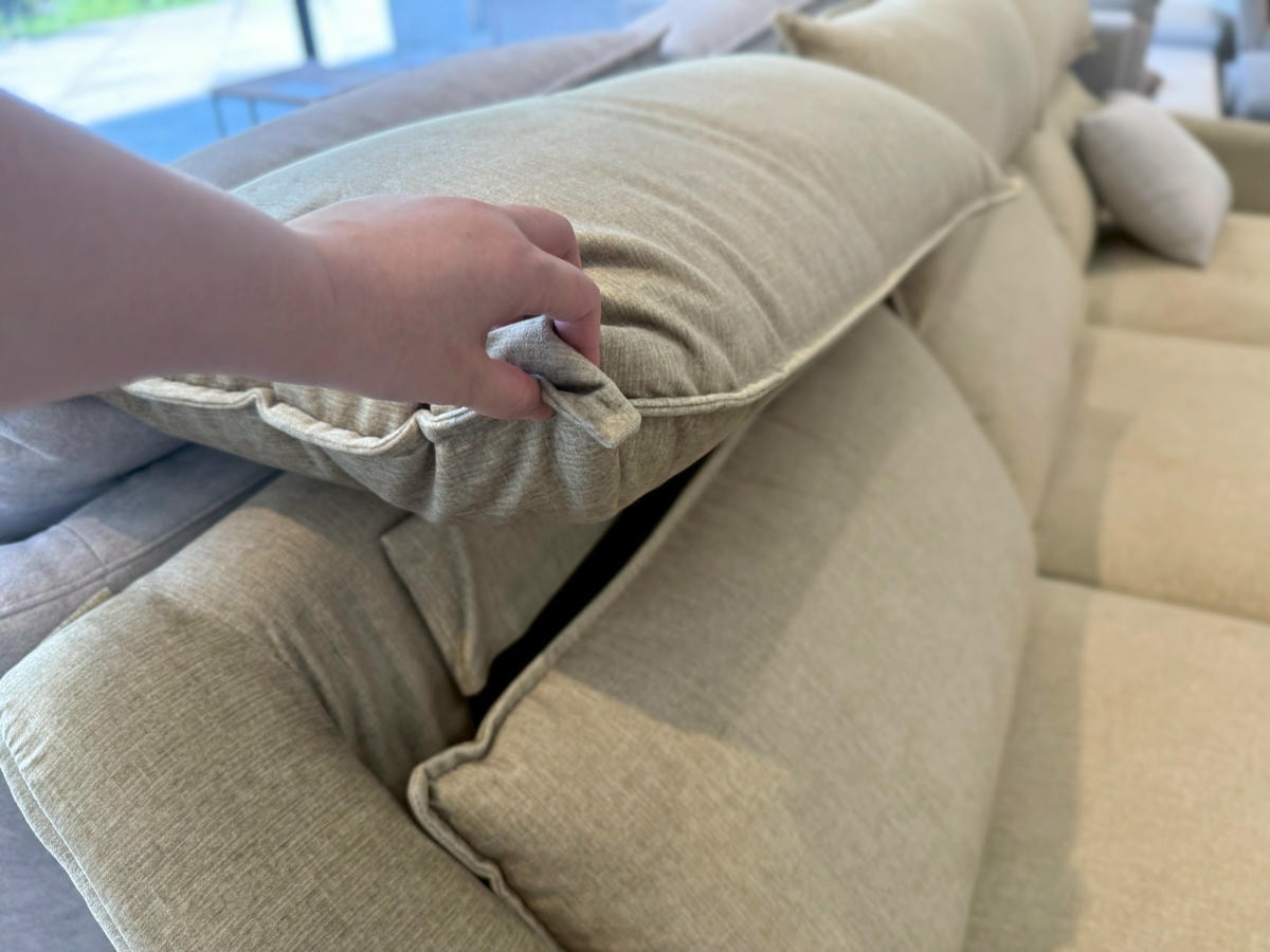 沙發採前高後低的坐感,沙發枕的背枕及頭枕採拉鏈式的拆裝,可全拆洗沙發的設計好方