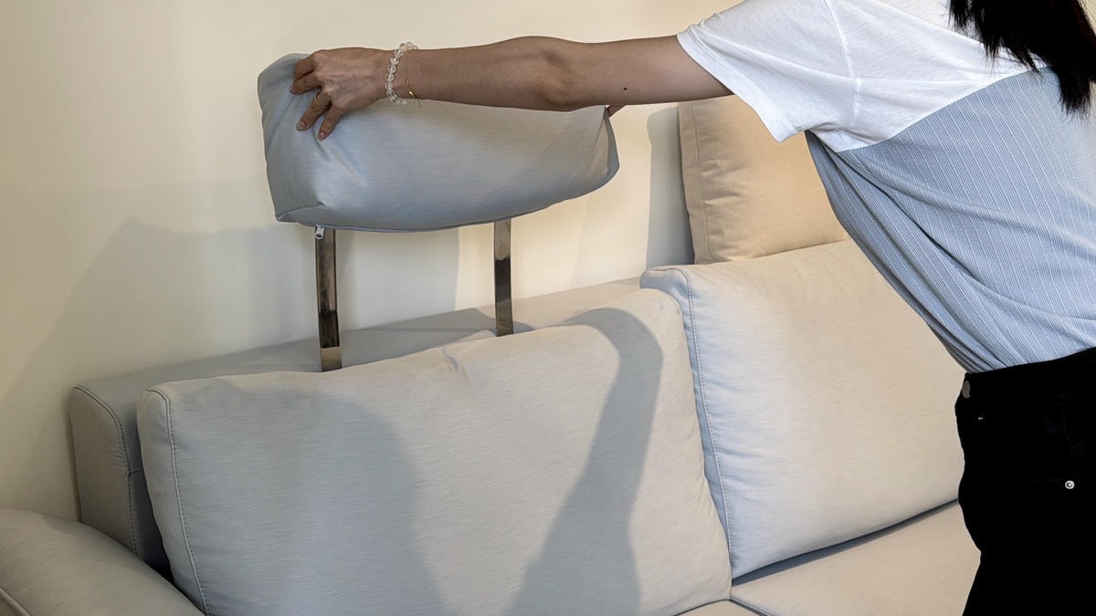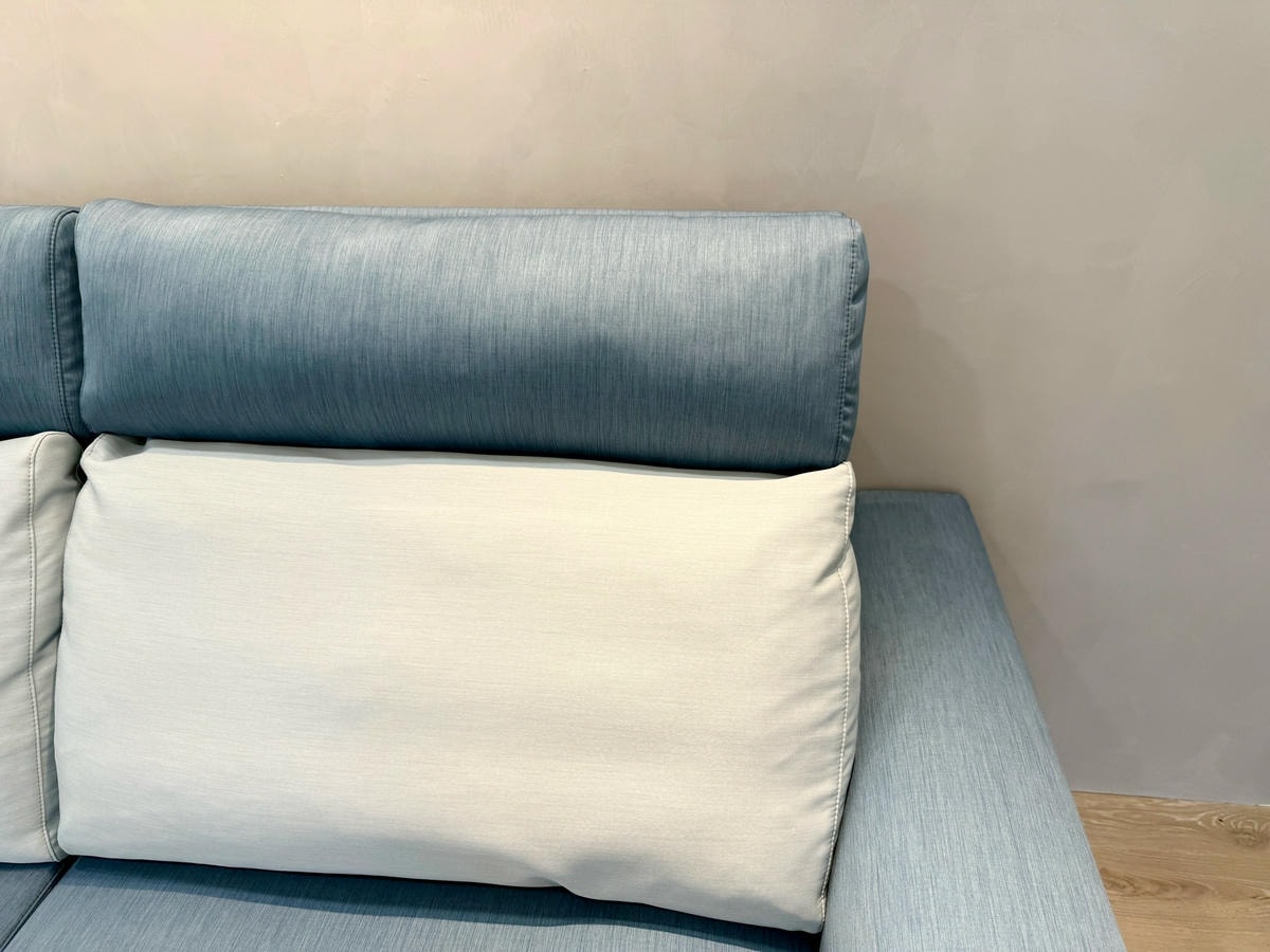 背部調整坐深的五金滑軌,這款L 型沙發是家中真正的「變形金剛」。背枕可前後移動,