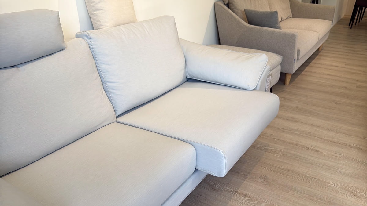 伊豆沙發也是L型沙發,現場展示使用的是很適合夏日的ABU涼感布,採用連結式彈簧,