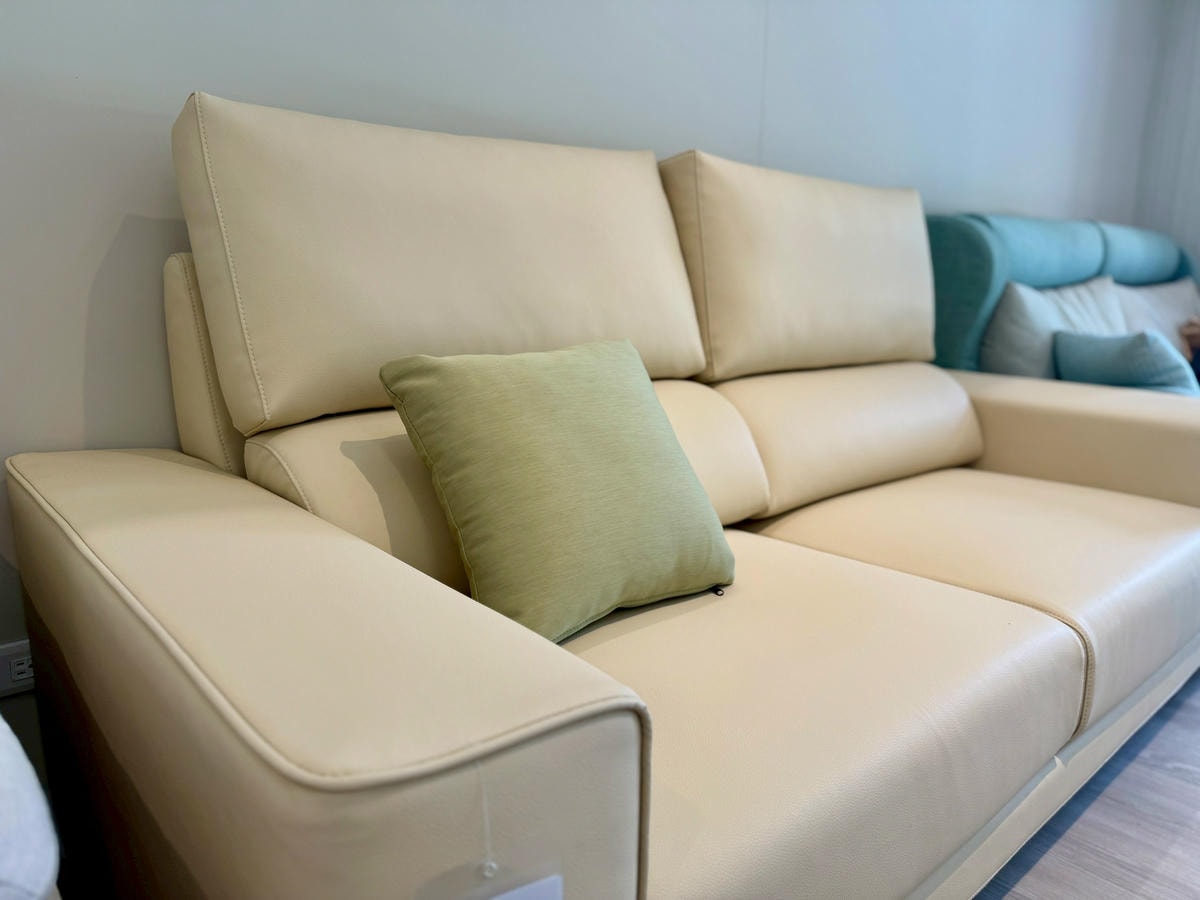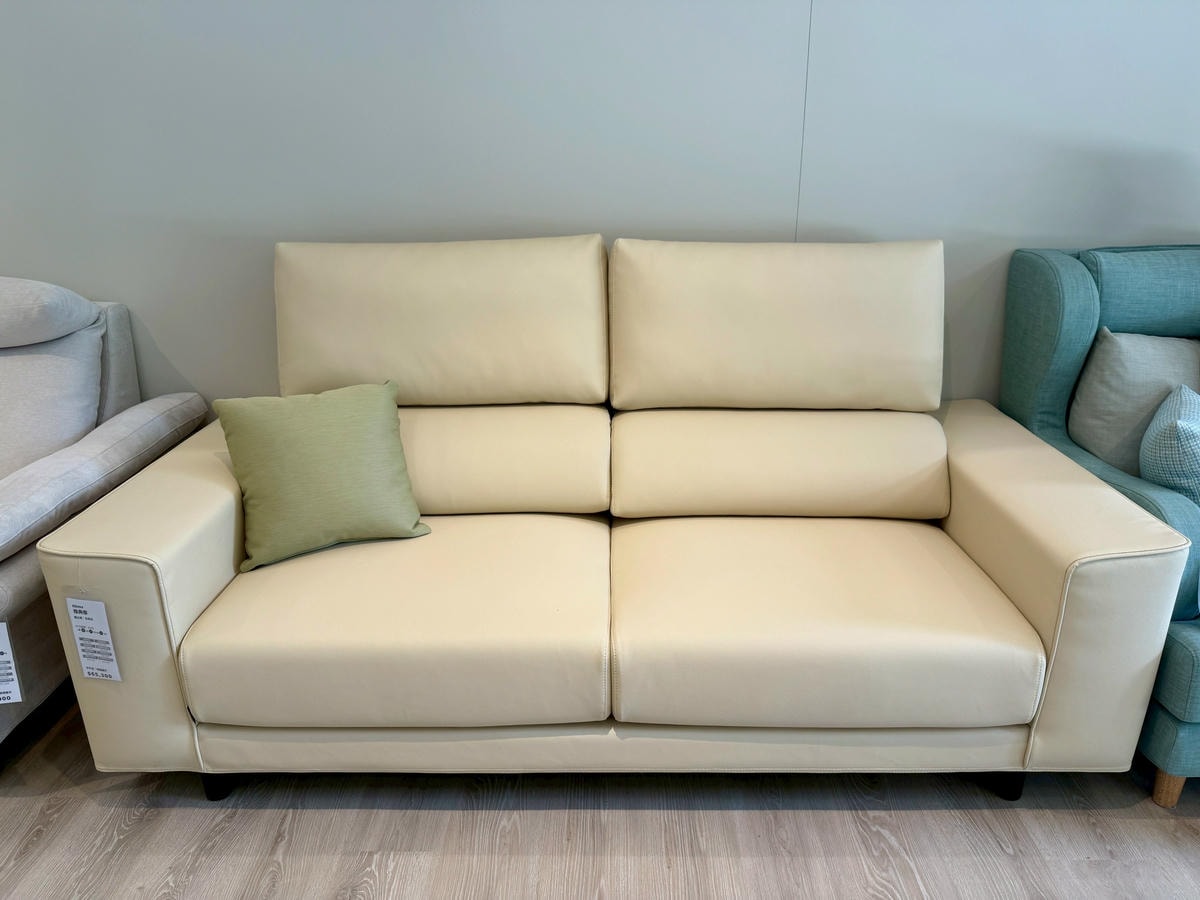 小家庭很適合的三人座沙發,現場展示的材質是半牛皮,淡黃色的設計很明亮溫馨