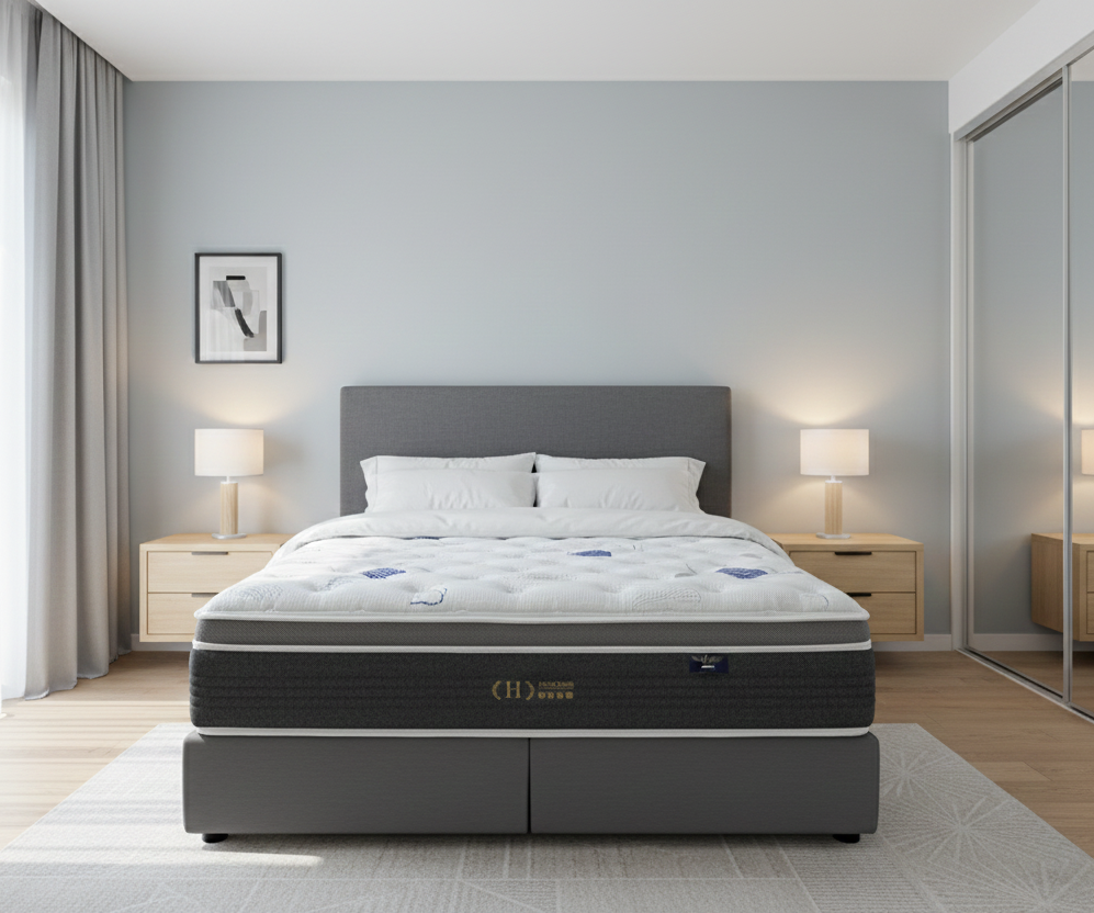 看不見的穩固:內部採用高規格的實木骨架,提供優異的承重力與結構穩定性,無論搭配獨立筒或乳膠床墊,都能安靜支撐您的每一次翻身。