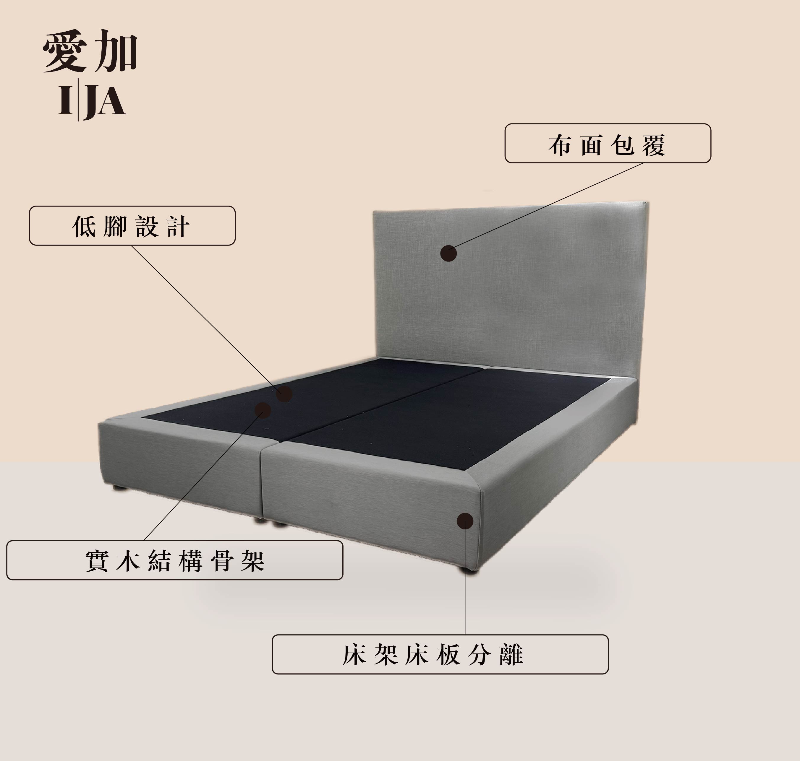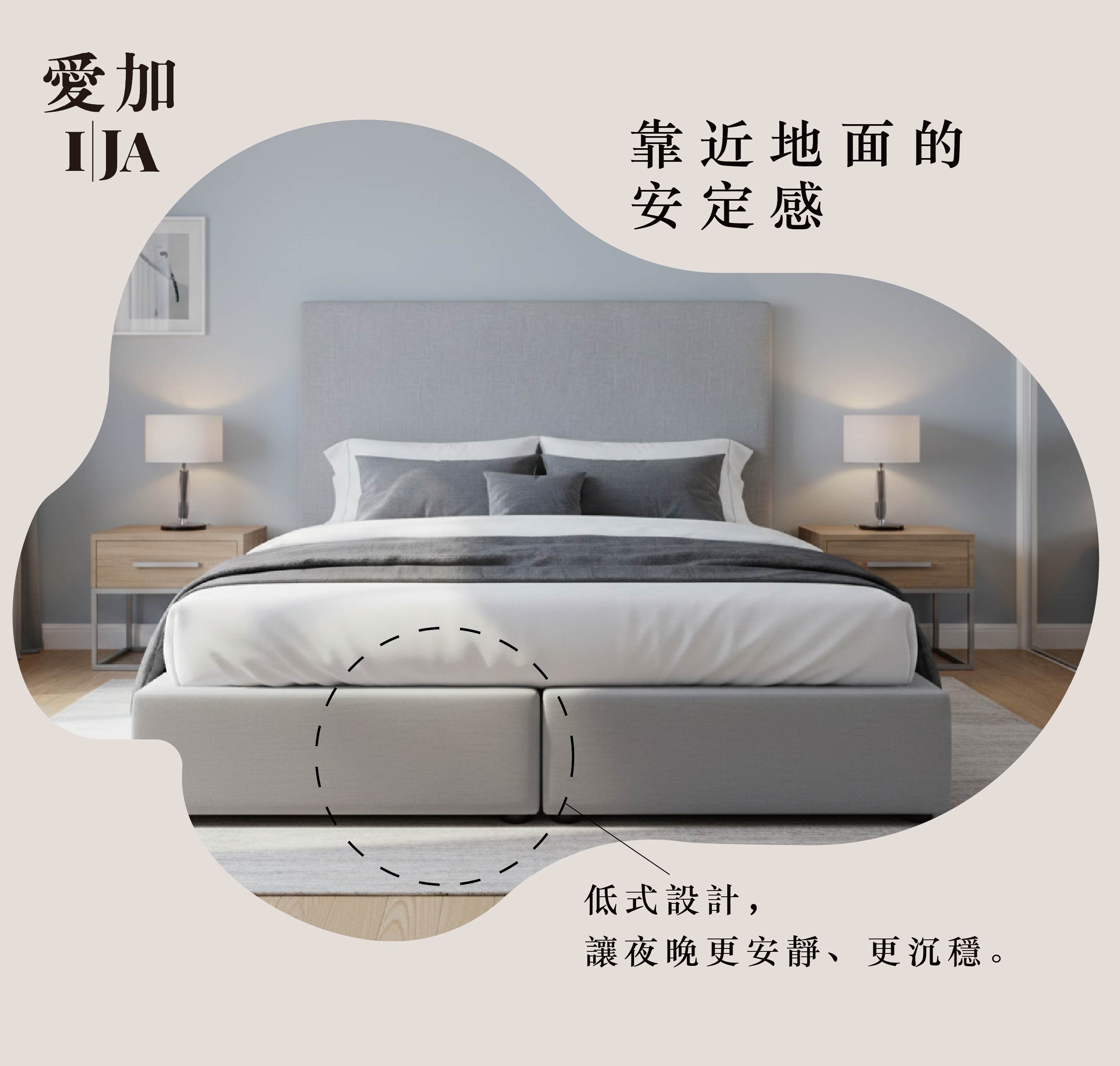 挑選床架時,耐用度是絕對不能妥協的關鍵。百富低式床架內部採用高規格的實木骨架,提供優異的結構支撐與靜音效果,無論搭配厚重的獨立筒床墊或乳膠床墊,都能穩固承托。 外層則以高品質布面全包覆,不僅觸感溫潤親膚,更具備實用的防撞緩衝功能。對於有幼童或寵物的家庭來說,這是一張沒有銳利邊角、能讓人安心使用的安全床架。它去除了多餘的裝飾,只保留臥房該有的純粹與安全感。